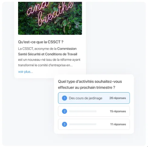 La plateforme CSE offre plusieurs outils pour faciliter la communication des comités sociales et économiques : fil d’actualité, sondage, trombinoscope, partage de fichiers, blog, gestion d’événements, collecte de fonds, stockage de documents …